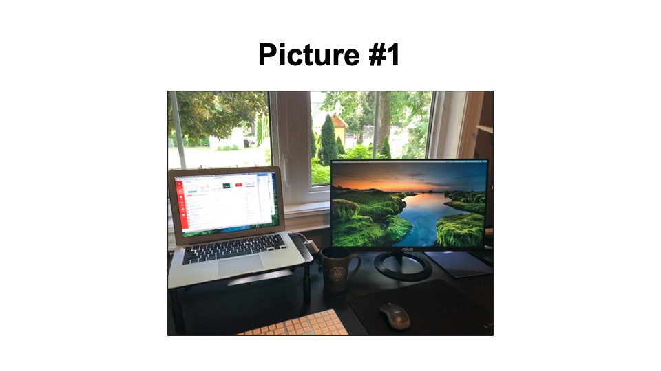Step One:  Prior to your next virtual meeting, ask all team members to snap a picture of something from their workspace or desk. This could be anything from a personal memento in their office, to the view from their chair, or even a photo of their pet that’s sitting next to them. They must then send their photo to you by email.  Be sure to remind them to send it to you in a private email and not a “reply-all” to the whole team. Compile the images into PowerPoint or Google Slides – one picture per slide – and a number next to each picture.  See photo below for an example.